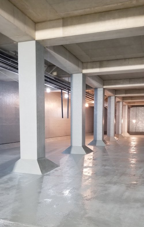 The walls and columns were coated with Series 237SC ChemBloc, a mat-reinforced, thick-film modified polyamine epoxy system. Series 237SC is most often applied to primary and secondary containment structures and is extremely good at protecting concrete from abrasion, impact, and chemical degradation. The topcoat used here was Series 280 Tneme-Glaze, a thin-film modified polyamine epoxy, known for hardening into a glaze-like, stain- and abrasion-resistant coating that handles pressurized hot water and detergent cleaning easily. All vertical surfaces were protected with this system at a total thickness of 80-125 mils DFT.